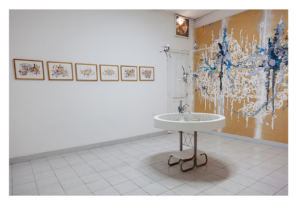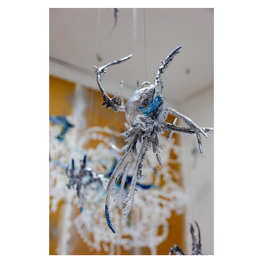 Andrés Paredes nos sumerge en una poética de la separación en la coexistencia. Una instalación suspendida en tensión, habitada por fragmentos orgánicos que se desplazan, suben, bajan, flotan… conviven… y se mueven, pero nunca se encuentran ni se tocan.